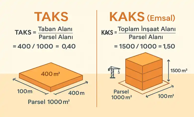 TAKS, arsanın zemininde kaplayabileceğiniz taban alanı yüzdesini sınırlar. Taban Alanı Kat Sayısı, parsel alanına uygulanır ve azami oturum alanını verir. Örneğin %30 TAKS, 1.000 m² parselde en fazla 300 m² taban oturumuna izin verir. Bu sınır; peyzaj, yangın güvenliği ve açık alan sürekliliği için konur.
